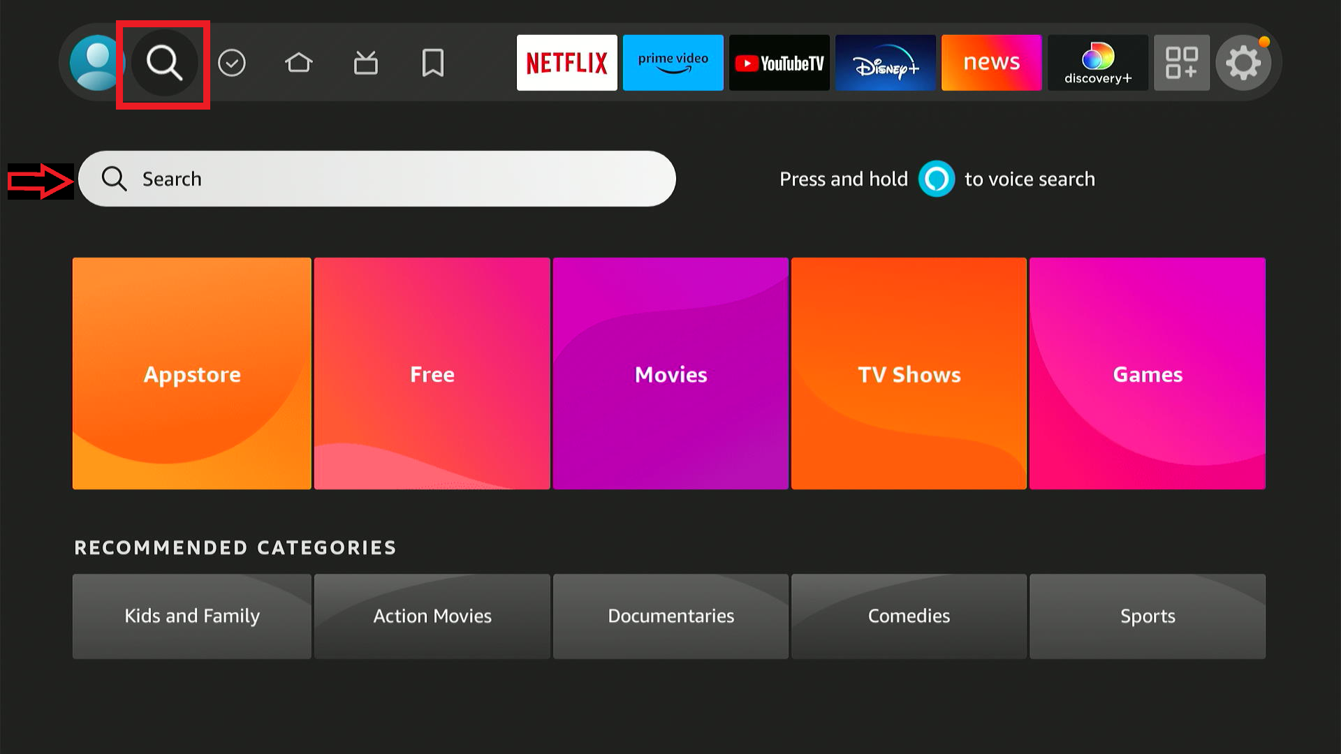 - Press the HOME button on your Firestick, Go to ‘Find‘ and click on the ‘Search‘ button.